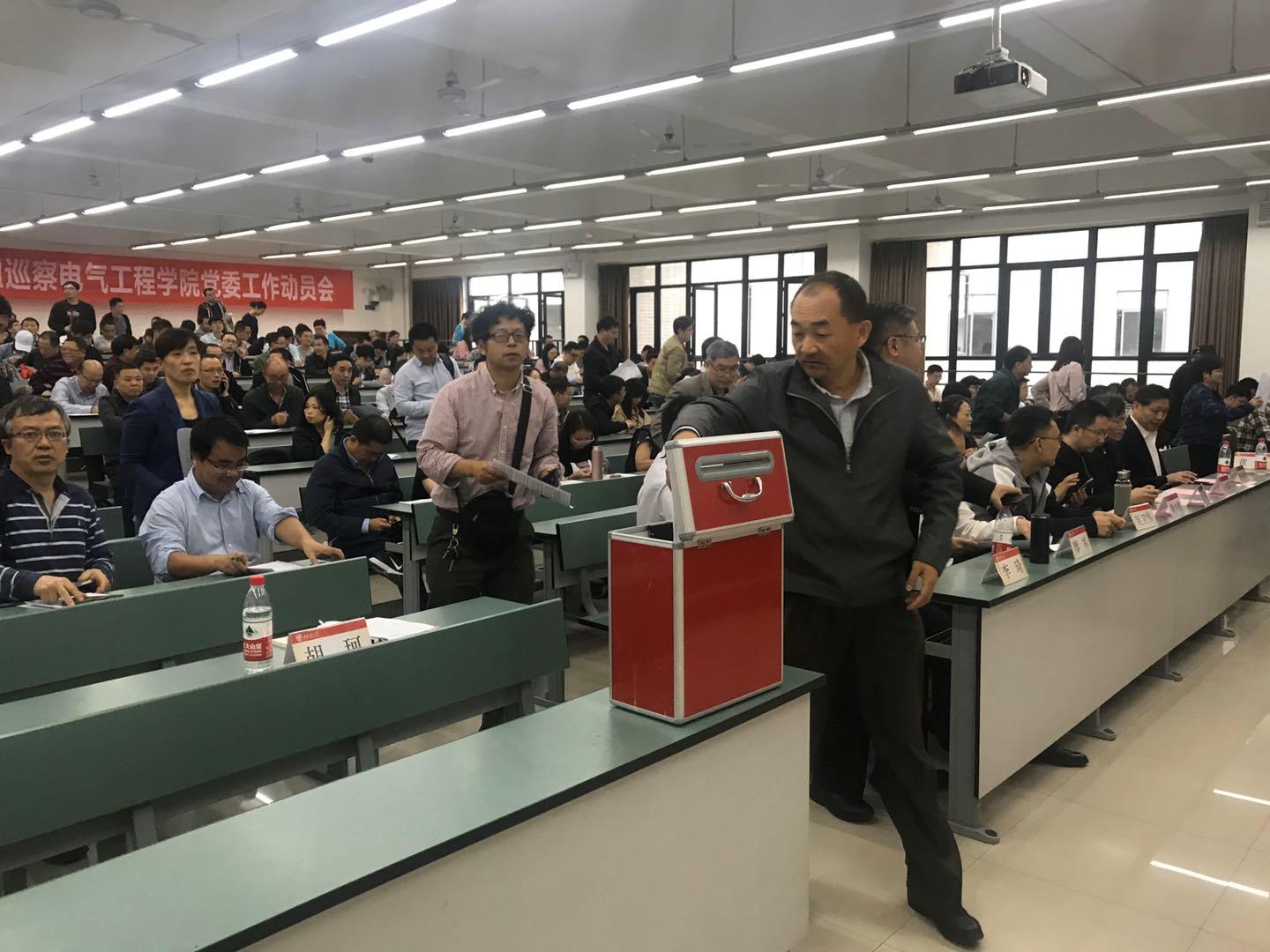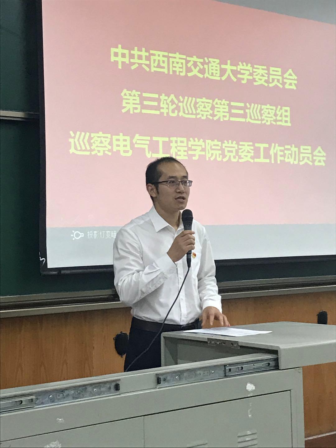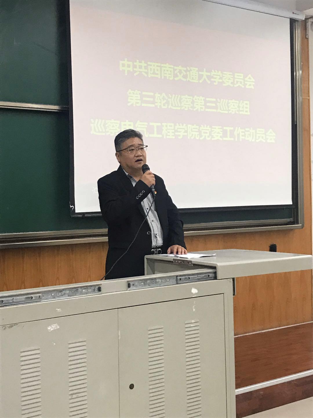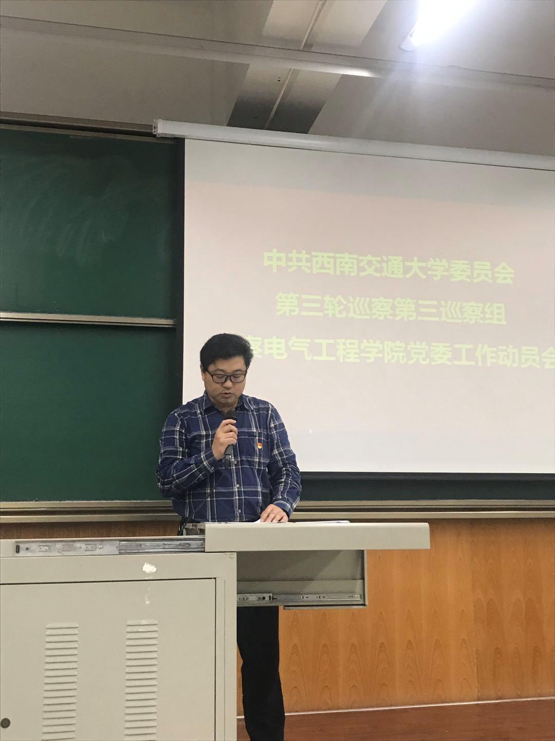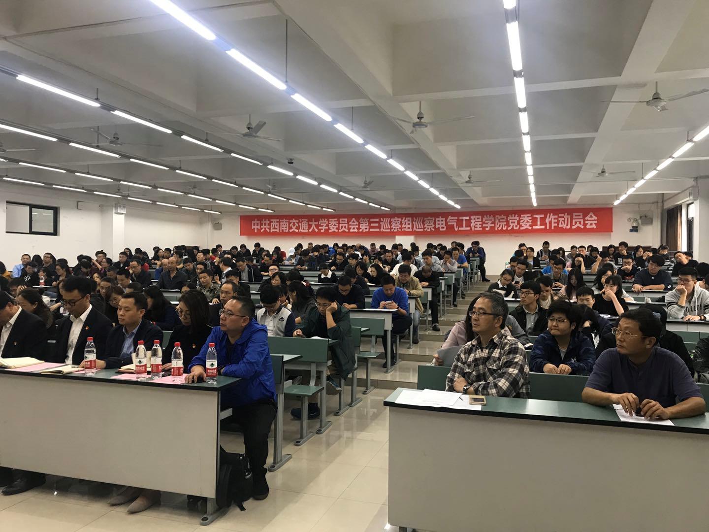 根据学校党委统一部署,2019年10月10日下午,中共西南交通大学委员会第三轮巡察第三巡察组巡察电气工程学院党委工作动员会召开。学校纪委副书记兼纪委办主任李琦,第三巡察组组长廖军,副组长郭书和、金建明及巡察组成员,电气工程学院党政领导班子成员、近期退出学院领导岗位的原班子成员、学院全体教职员工、离退休人员代表和学生代表等出席动员会。会议由电气工程学院党委书记罗乾超主持。