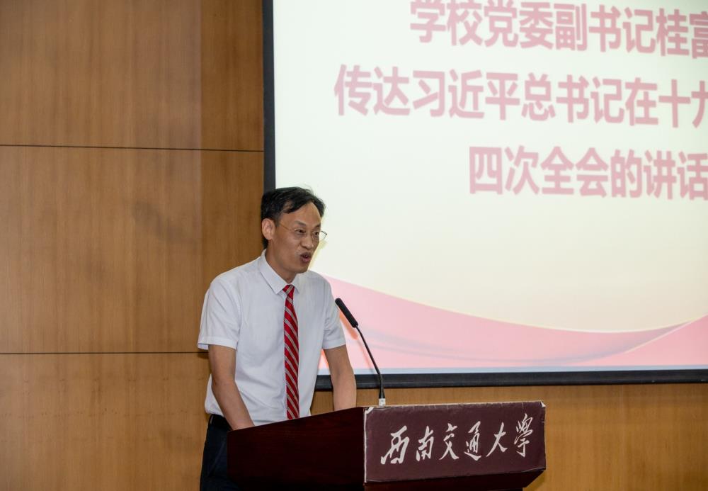 校党委副书记桂富强传达了习近平总书记在十九届中央纪委四次全会的讲话精神,强调全校各级党组织和领导干部要进一步提高政治站位,结合工作实际切实抓好贯彻落实,推进全面从严治党不断深入。