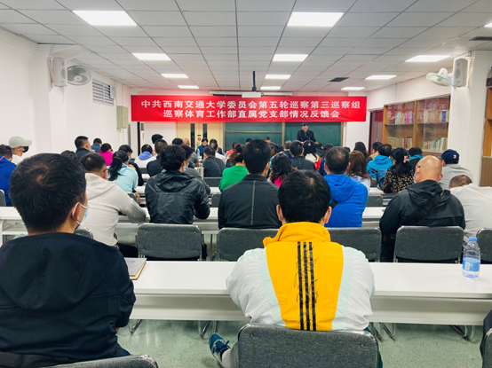 按照学校党委工作安排,10月14日下午,学校党委第五轮巡察第三巡察组向体育工作部直属党支部反馈巡察情况。组长金建明分别向体育工作部直属党支部主要负责人和领导班子反馈了巡察情况。联系体育工作部的校领导周仲荣副校长出席了个别反馈会并做了讲话,对整改工作做了指导。学校党委宣传部常务副部长汪铮受学校党委巡察工作领导小组委托出席了会议,纪检监察部门、党委组织部门有关同志、副组长张东府、李锦红出席了反馈会,直属党支部书记潘喆做了表态发言,行政负责人刘江主持反馈会。