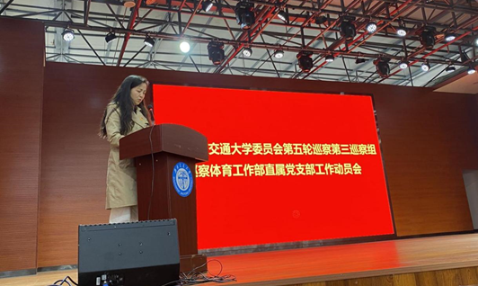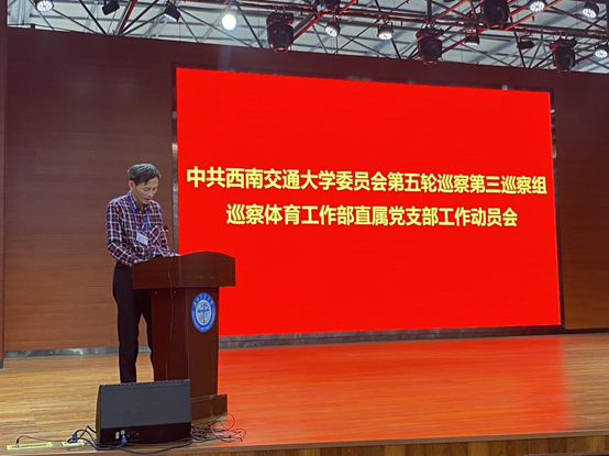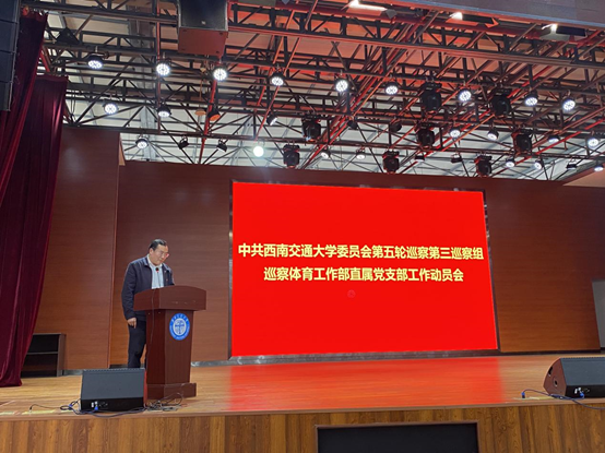 2021年4月22日,中共西南交通大学委员会第五轮巡察第三巡察组巡察体育工作部直属党支部工作动员会召开。动员会前,巡察组与体育工作部领导班子作了见面沟通。会上,第三巡察组组长金建明作了动员讲话,通报了巡察工作主要任务、工作安排和要求,学校正处级纪检监察员曹宏伟受学校党委巡察工作领导小组委托对做好巡察工作提出了要求。直属支部书记潘喆作表态发言,主任刘江主持会议。